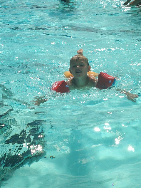 Och en dag vid poolbadet blev det ju igår också även om vi bara var där några timmar. Jag föredrar faktiskt pooler framför sjöar av den anledningen att det känns renare och just vid det här badet vi brukar åka till är det så perfekt med gräsmattor så man kan ligga alldeles vid poolen och hålla koll på de små när de badar. Det finns duschar med varmvatten så de kan värma sig när de blir kalla och framförallt är det perfekt för den aktivitet vi håller på med den här sommaren....att lära de två små att simma. Sååå mycket enklare i en pool där man kan stå själv på lite djupare vatten medans de övar samtidigt som de ser botten och har tryggheten i att veta hur djupt det är. De mååååste verkligen lära sig den här sommaren för alla simskolor i den här pyttestan går vid jätteknasiga tider mitt på dagen och det är ju jättesvårt för oss som pendlar att åka ifrån jobb och så.